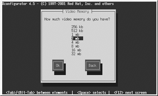 カードに搭載されているカードのメモリの容量が分からない場合は、ビデオカードに 添付された取扱説明書を確認して下さい。カードにあるメモリよりも大きい容量を 選択してもカードを損傷することはありませんが、XFree86サーバが正しく起動しない 原因になる可能性があります。
