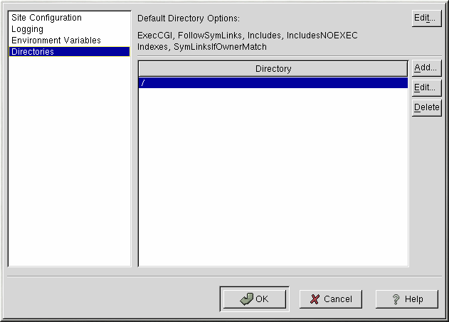 Use the Directories page to configure options for specific directories. This corresponds to the <Directory> directive.