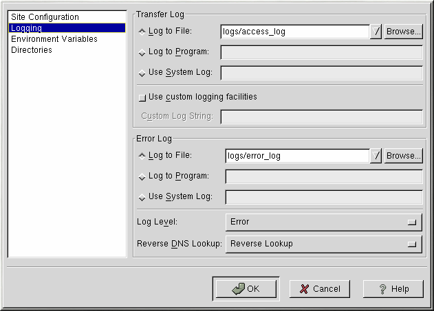 The transfer log contains a list of all attempts to access the Web server. It records the IP address of the client that is attempting to connect, the date and time of the attempt, and the file on the Web server that it is trying to retrieve. Enter the name of the path and file in which to store this information. If the path and filename does not start with a slash (/), the path is relative to the server root directory as configured. This option corresponds to the TransferLog directive.