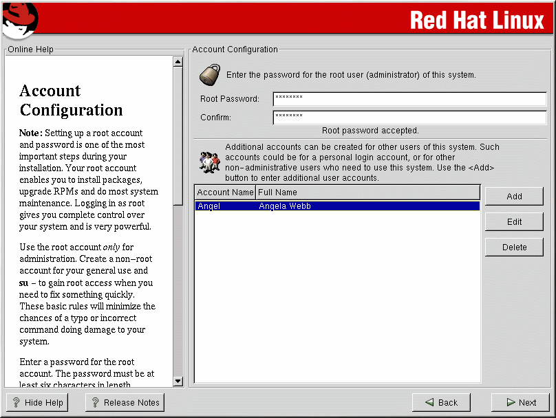Setting up a root account and password is one of the most important steps during your installation. Your root account is similar to the administrator account used on Windows NT machines. The root account is used to install packages, upgrade RPMs, and perform most system maintenance. Logging in as root gives you complete control over your system.
