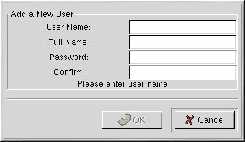 Enter an account name. Then enter and confirm a password for that user account. Enter the full name of the account user and press Add. Your account information will be added to the account list, and the user account fields will be cleared so that you can add another user.