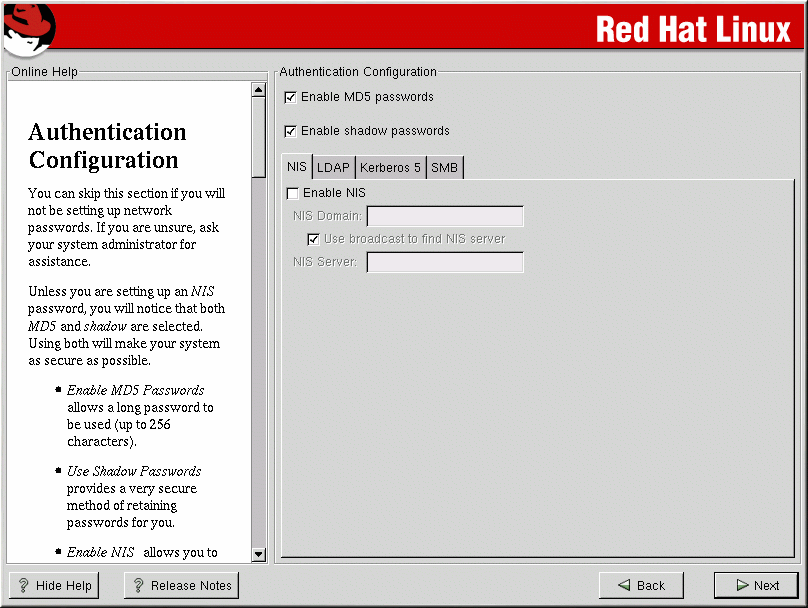 Enable Kerberos — Kerberos is a secure system for providing network authentication services. For more information about Kerberos, see Using Kerberos 5 on Red Hat Linux in the Official Red Hat Linux Reference Guide. There are three options to choose from here: