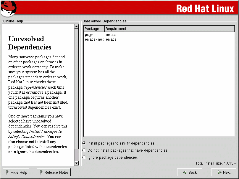 If any package requires another package which you have not selected to install, the program presents a list of these unresolved dependencies and gives you the opportunity to resolve them (see Figure 2-21).
