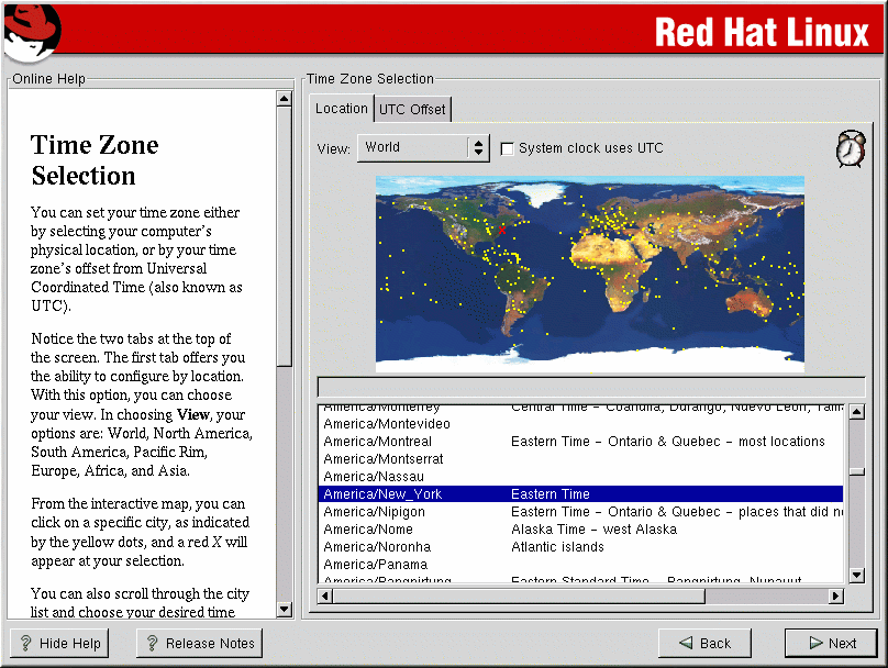 If you wish to change your time zone configuration after you have booted your Red Hat Linux system, become root and use the /usr/sbin/timeconfig command. |