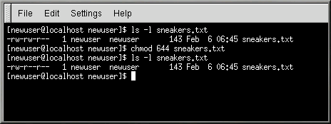 If you want to change sneakers.txt so those in your group will not have write access, but can still read the file (as shown in Figure 10-16), remove the access by subtracting 2 from that set of numbers.