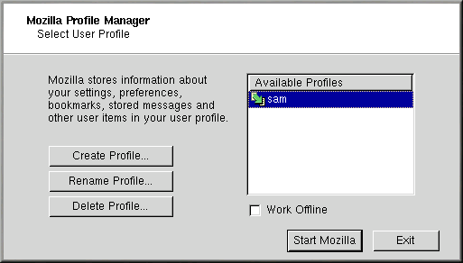 To add new profiles or delete existing profiles later on, you will need to run the Mozilla Profile Manager again. To launch the Mozilla Profile Manager, at the shell prompt type the following command: