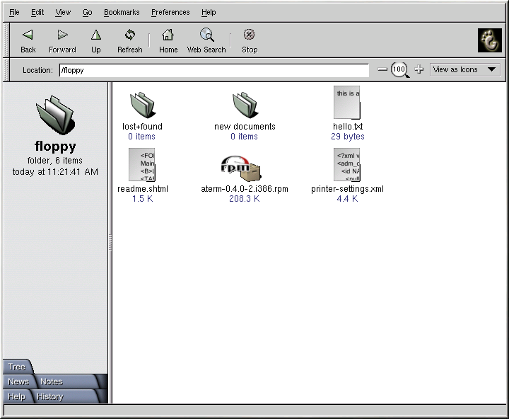 Now that the diskette has been mounted it is available to be copied from or written to. You can open, save, and copy files to/from it as you would normally do to your hard drive. You can even explore the diskette's contents in Nautilus or Konqueror, as shown in Figure 4-1.
