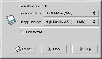 In GNOME, go to Main Menu => Programs => Utilities => gfloppy to start gfloppy. In KDE, go to Start Application => Programs => Utilities => gfloppy. From a shell prompt, type /usr/bin/gfloppy. As shown in Figure 4-2, the gfloppy interface is small and has few options. The default settings are sufficient for most users and needs; however, you can format your diskette with an MS-DOS file system type if you desire. You can also choose the density of your floppy disk (if you are not using the usual high density 3.5" 1.44MB diskette. You can also elect to quick format the diskette if it was previously formatted as ext2.