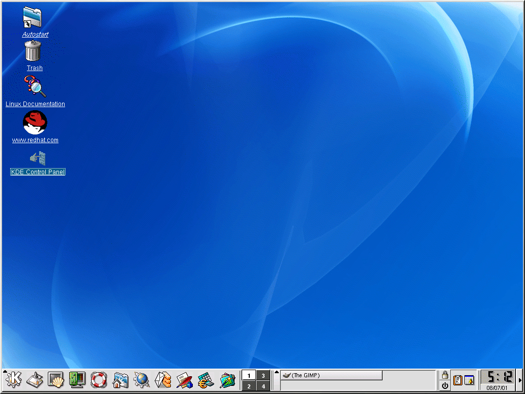 The default KDE desktop displays icons for the trash can, your home directory, the KDE Control Panel, and a link to the Red Hat website. You can access any one of these resources by clicking on the associated icon.