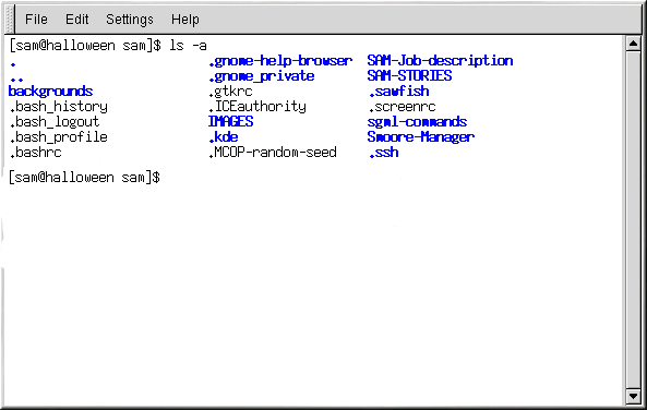 Many options are available with the ls command. The ls command, by itself, will not show you all the files in your directory. Some files are hidden files (also called dot files) and can only be seen with an additional option specified to the ls command.