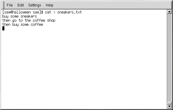[sam@halloween sam]$cat > sneakers.txt buy some sneakers then go to the coffee shop then buy some coffee |
