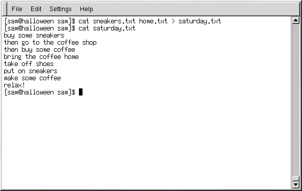 [sam@halloween sam]$cat sneakers.txt home.txt > saturday.txt |
