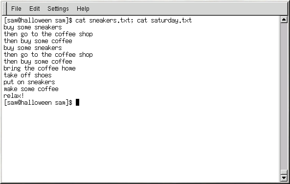 [sam@halloween sam]$cat sneakers.txt buy some sneakers then go to the coffee shop then buy some coffee bring the coffee home take off shoes put on sneakers make some coffee relax! [sam@halloween sam]$ |