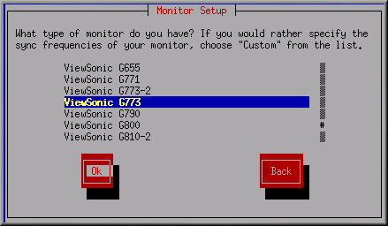 If you do not find your monitor among the listed makes and models, you can specify your monitor's horizontal and vertical sync frequencies by choosing Custom in the list. Refer to your monitor's documentation for information about its correct frequency rates. Be careful! Do not select a frequency range which exceeds your monitor's capacity, because you could damage or destroy it. |