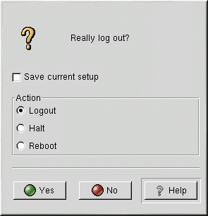When the confirmation dialog appears as shown in Figure 1-11, select the Logout option and click the Yes button. If you want to save the configuration of your desktop, as well as any programs which are running, check the Save current setup option, as well.