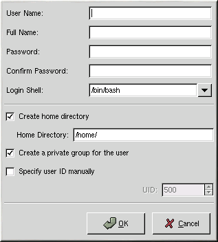 To specify a user ID for the user, select Specify user ID manually. If the option is not selected, the next available user ID starting with number 500 will be assigned to the new user. Red Hat Linux reserves user IDs above 500 for system users.