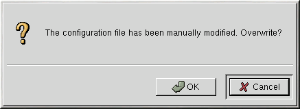 If this is the first time that you have used the Apache Configuration Tool, you will see the dialog window shown in Figure 13-16, warning you that the configuration file has been manually modified. If the Apache Configuration Tool detects that the httpd.conf configuration file has been manually modified, it will save the manually modified file as /etc/httpd/conf/httpd.conf.bak.