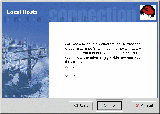 If there are Ethernet devices on the system, the Local Hosts page allows you to configure whether the firewall rules apply to connection requests sent to each device. If the device connects the system to a local area network behind a firewall and does not connect directly to the Internet, select Yes. If the Ethernet card connects the system to a cable or DSL modem, it is recommended that you select No.