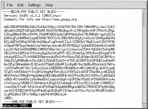 Open your exported public key file (such as mykey.asc, which was created in the Section called Exporting your Public Key) with a pager — for example, use the less mykey.asc command.