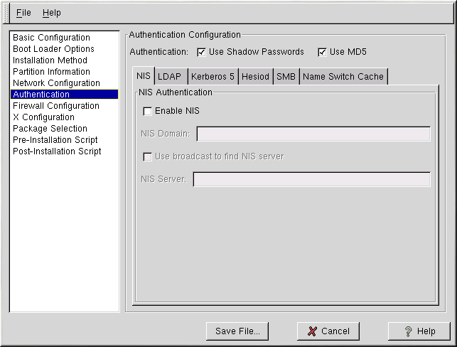 In the Authentication section, select whether to use shadow passwords and md5 encryption for user passwords. These options are highly recommended and chosen by default.