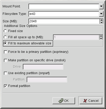To create a partition, click the Add button. The Partition Options window shown in Figure 2-5 will appear. Choose mount point, filesystem type, and partition size for the new partition. Optionally, you can also choose from the following: