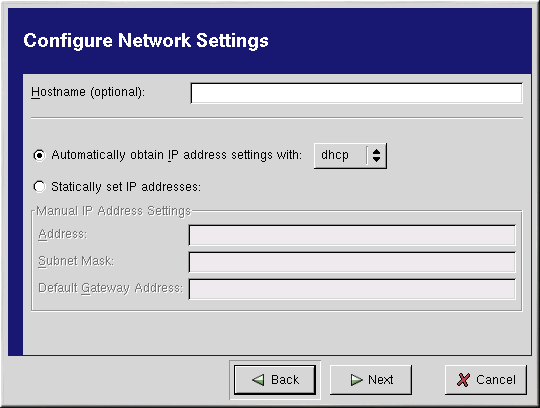 On the Configure Network Settings page as shown in Figure 6-1, choose between DHCP and a static IP address. You may also specify a hostname for the device. If the device receives a different IP address each time the network is started, do not specify a hostname. Click Next to continue.