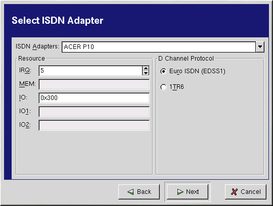 4. Select the ISDN adapter from the pulldown menu. Then configure the resources and D channel protocol for the adapter. Click Next to continue.