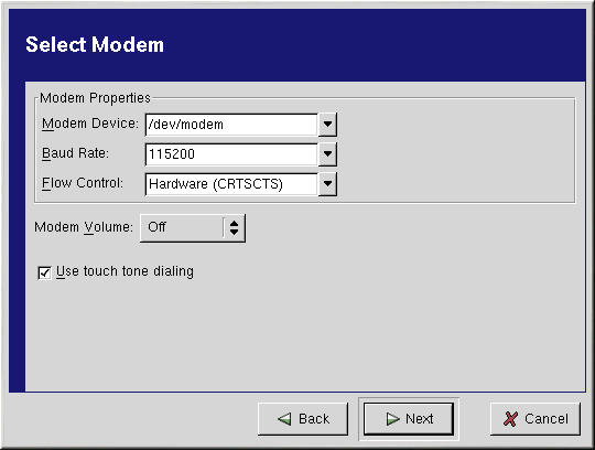 6. Configure the baud rate, flow control, and modem volume. If you do not know these values, accept the defaults. If you do not have touch tone dialing, uncheck the corresponding checkbox.