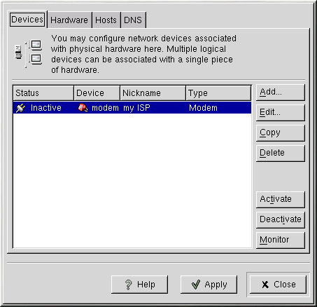 After adding the modem device, you can edit its configuration by selecting the device from the device list and clicking Edit. For example, when the device is added, it is configured not to start at boot time by default. Edit its configuration to modify this setting. Compression, PPP options, login name, password, and more can also be changed.