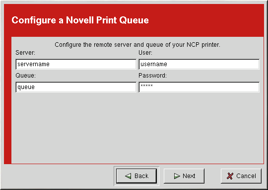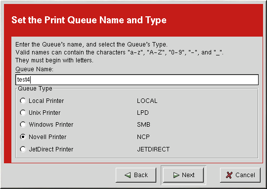 To add a Novell NetWare (NCP) printer, click the New button in the main printconf window. The window shown in Figure 21-1 will appear. Click Next to proceed.