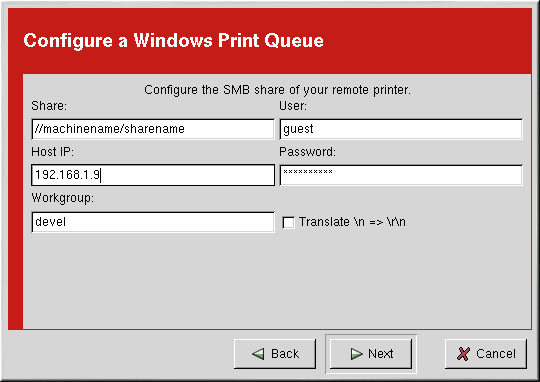 Share — The name of the shared printer on which you want to print. This name must be the same name defined as the Samba printer on the remote Windows machine. Notice the syntax of //machinename/sharename.