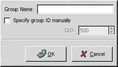 To add a new user group, click the New Group button. A window similar to Figure 19-4 will appear. Type the name of the new group to create. To specify a group ID for the new group, select Specify group ID manually and select the GID. Red Hat Linux reserves group IDs lower than 500 for system groups.