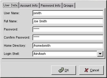 User Data — Basic user information configured when you added the user. Use this tab to change the user's full name, password, home directory, or login shell.