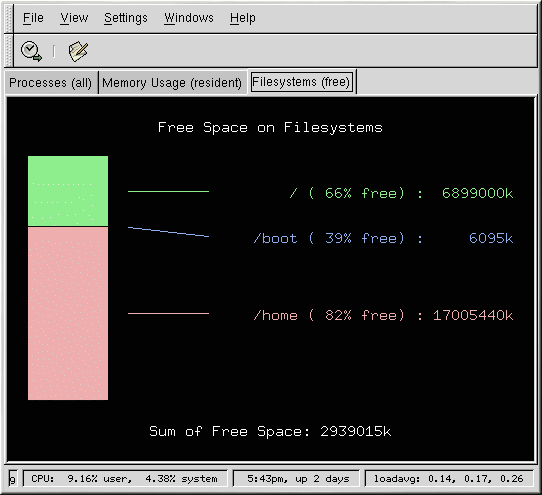 To view the system's disk space usage in a graphical format, use the Filesystems tab in the GNOME System Monitor. To start it on the GNOME desktop, go to the Main Menu Button (on the Panel) => Programs => System => System Monitor or type gtop at a shell prompt from within any X Window System desktop. Then choose the Filesystems tab.