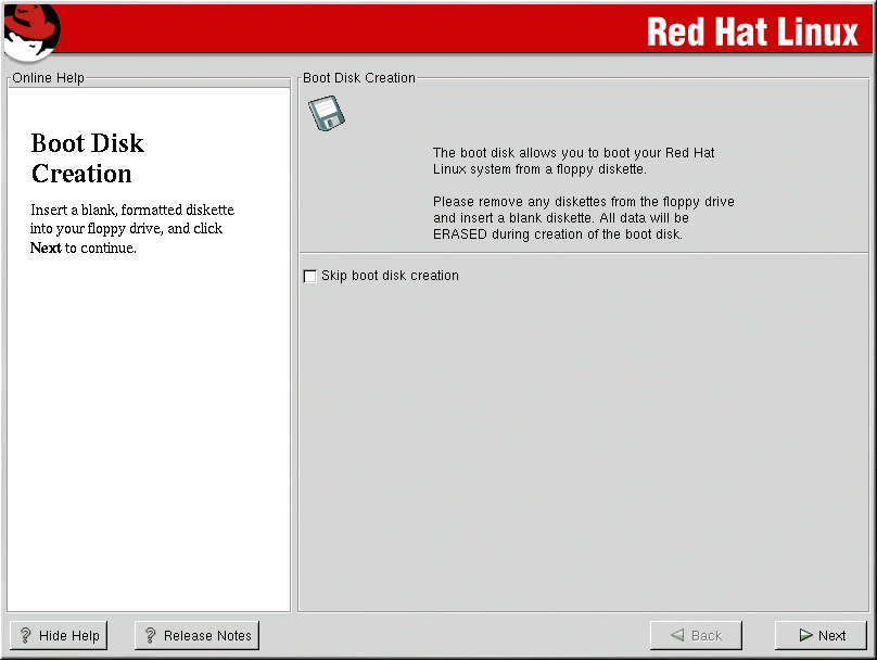 After a short delay, your boot disk will be created; remove it from your diskette drive and label it clearly. Note that if you would like to create a boot disk after the installation, you will be able to do so. For more information, please see the mkbootdisk man page, by typing man mkbootdisk at the shell prompt.