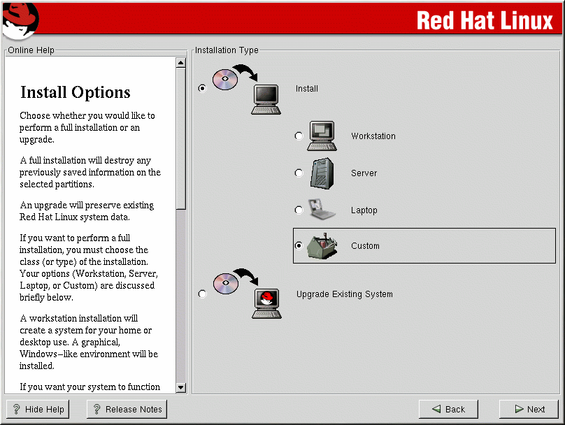 Choose the type of installation you would like to perform (see Figure 3-10). Red Hat Linux allows you to choose the installation type that best fits your needs. Your options are Workstation, Server, Laptop, Custom, and Upgrade.