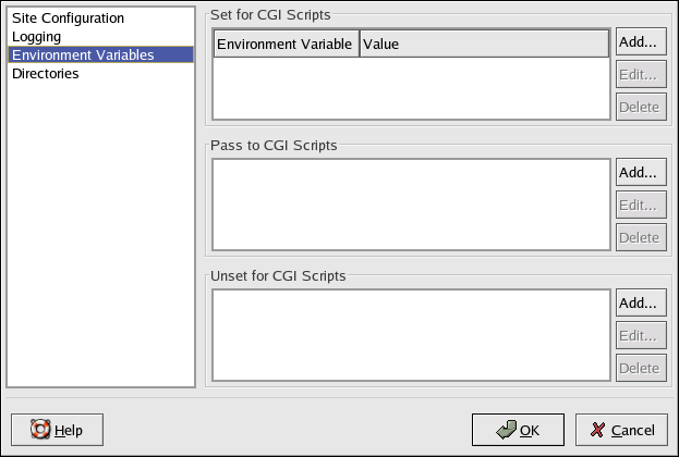 Use the Pass to CGI Scripts section to pass the value of an environment variable when the server was first started to CGI scripts. To see this environment variable, type the command env at a shell prompt. Click the Add button inside the Pass to CGI Scripts section and enter the name of the environment variable in the resulting dialog box. Click OK. The Pass to CGI Scripts section configures the PassEnv directive.
