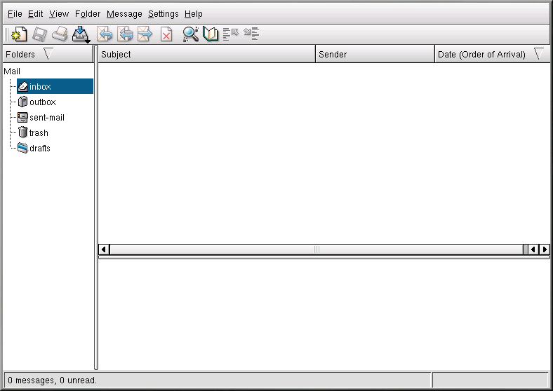 Before you can really use KMail, you must configure it so it can send and receive mail. To run the configuration tool, select Settings from the KMail toobar, and click on Configure KMail.