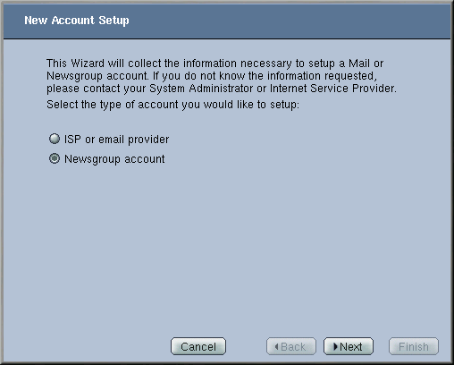 To join a newsgroup, you first need to set up a newsgroup account. Click on your mail account name in the sidebar and select Create a new account from the options that appear on the right of the screen. The New Account Setup screen will appear. Select Newsgroup account and then click Next.
