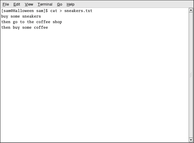 [sam@halloween sam]$cat > sneakers.txt buy some sneakers then go to the coffee shop then buy some coffee |