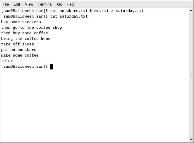 [sam@halloween sam]$cat > home.txt bring the coffee home take off shoes put on sneakers make some coffee relax! |