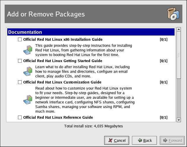 If you have the Official Red Hat Linux boxed set, remember to take a look through the Red Hat Linux Documentation CD. All of the Official Red Hat Linux manuals are on this CD. Individual downloads of our documentation in HTML, RPM, PDF, and compressed tarball format (.tar.gz) are also available at http://www.redhat.com/docs/. Once you have logged in to your user account, inserting the Documentation CD in your CD-ROM drive should automatically start the Package Management Tool and allow you to install any of the Official Red Hat Linux documentation. Follow the instructions and choose the documentation you would like to install.