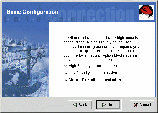 High Security — This option disables almost all network connects except DNS replies and DHCP so that network interfaces can be activated. IRC, ICQ, and other instant messaging services as well as RealAudioTM will not work without a proxy.