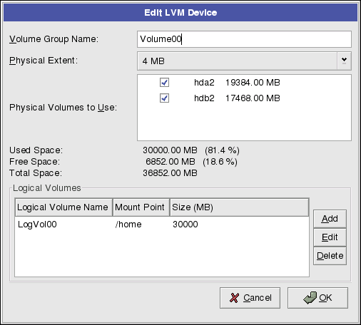 All logical volumes inside the volume group must be allocated in physical extent units. By default, the physical extent is set to 4 MB; thus, logical volume sizes must be divisible by 4 MBs. If you enter a size that is not a unit of 4 MBs, the installation program will automatically select the closest size in units of 4 MBs. It is not recommended that you change this setting.
