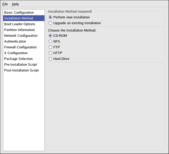 The Installation Method screen allows you to choose whether you want to perform a full installation or an upgrade. If you choose upgrade, the Partition Information and Package Selection options will be disabled. They are not supported for kickstart upgrades.