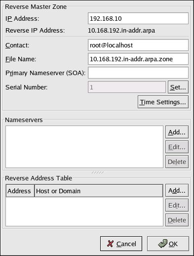 Reverse Address Table — List of IP addresses within the reverse master zone and their hostnames. For example, for the reverse master zone 192.168.10, you can add 192.168.10.1 in the Reverse Address Table with the hostname one.example.com. The hostname must end with a period (.) to specify that it is a full hostname.