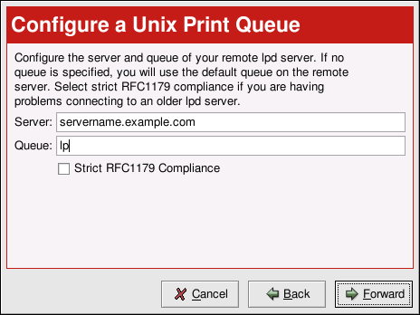Queue — The remote printer queue. The default printer queue is usually lp.