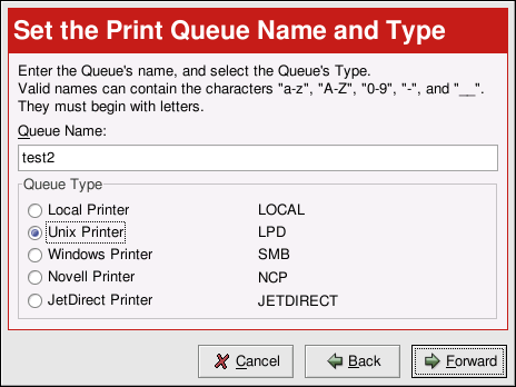 You will then see the screen shown in Figure 26-5. Enter a unique name for the printer in the Queue Name text field. The printer name cannot contain spaces and must begin with a letter a through z or A through Z. The valid characters are a through z, A through Z, 0 through 9, -, and _.
