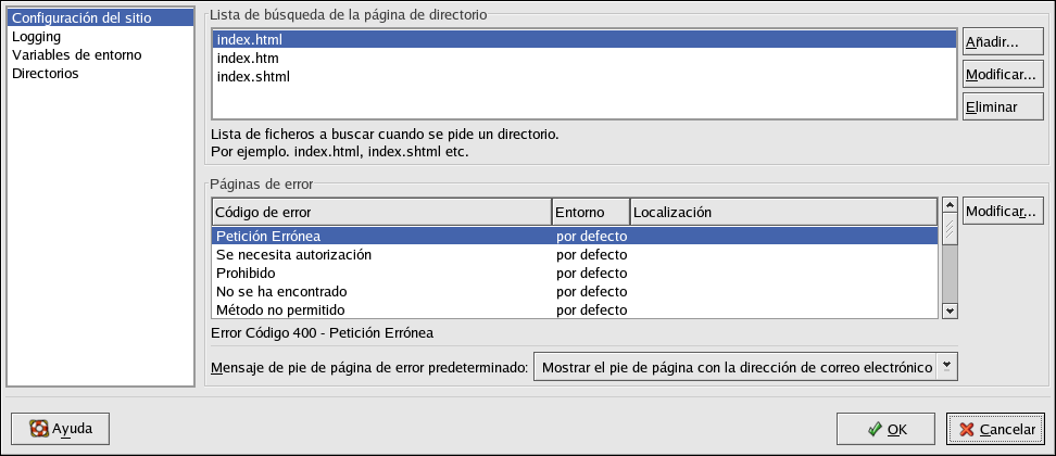 Use la sección Código de Error para configurar Servidor Apache HTTP a que redireccione el cliente a un URL local o externo en el evento de un problema o error. Esta opción responde a la directiva ErrorDocument. Si ocurre un problema o error cuando un cliente intenta conectarse al Servidor Apache HTTP, la acción por defecto es mostrar un mensaje corto de error como se muestra en la columna Código de Error. Para ignorar esta configuración por defecto, seleccione el código del error y haga click en Modificar. Seleccione Predeterminado para desplegar un mensaje corto de error. Escoja URL para redirigir el cliente a un URL externo e introduzca un URL completo incluyendo http:// en el campo Ubicación. Seleccione Archivo para redirigir el cliente a un URL interno e introduzca la ubicación de un archivo bajo el documento raíz para el servidor Web. La ubicación debe comenzar con un símbolo de barra oblícua (/) y ser relativo al Documento raíz (Document Root).