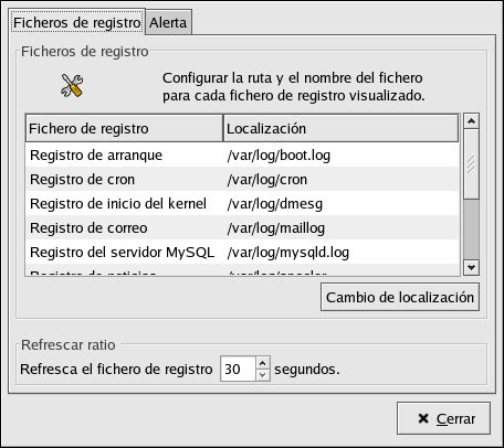 Para visualizar los archivos log en una aplicación interactiva en tiempo real, utilice la Visor de registros del sistema. Para iniciar la aplicación, vaya a Botón del menú principal (en el Panel) => Herramientas del sistema => Registros del sistema, o escriba el comando redhat-logviewer en el intérprete de comandos de la shell.